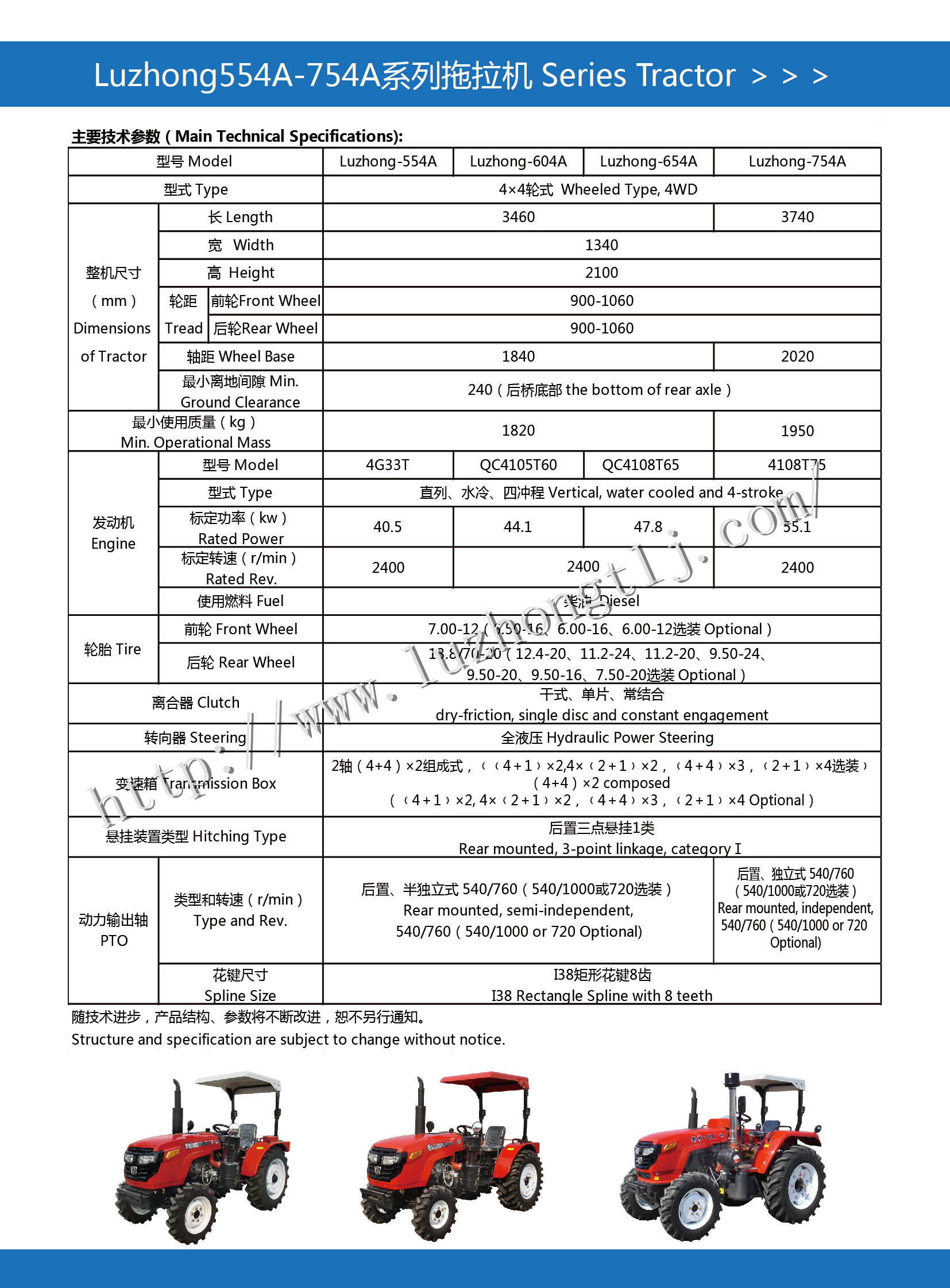 匹配60馬力國內(nèi)名優(yōu)國三發(fā)動機(jī),排放升級,油耗低,扭力儲備大,動力強(qiáng)勁。超短軸距設(shè)計(jì),標(biāo)配可調(diào)方向盤,操縱更靈活,液壓獨(dú)立供油,全液壓獨(dú)立轉(zhuǎn)向,轉(zhuǎn)彎半徑小。采用雙作用離合器,8+4檔中拖底盤,可選裝側(cè)變速掛檔,爬行檔,梭式換檔,檔位匹配合理。可選裝強(qiáng)壓提升器,提升力大,提升速度快,可靠性更高,可選裝雙輪胎,增加驅(qū)動力。全新流線型雕塑機(jī)罩,外形更美觀。應(yīng)用廣泛,可滿足大棚、林果業(yè)、普通農(nóng)田等地域的耕種需求。